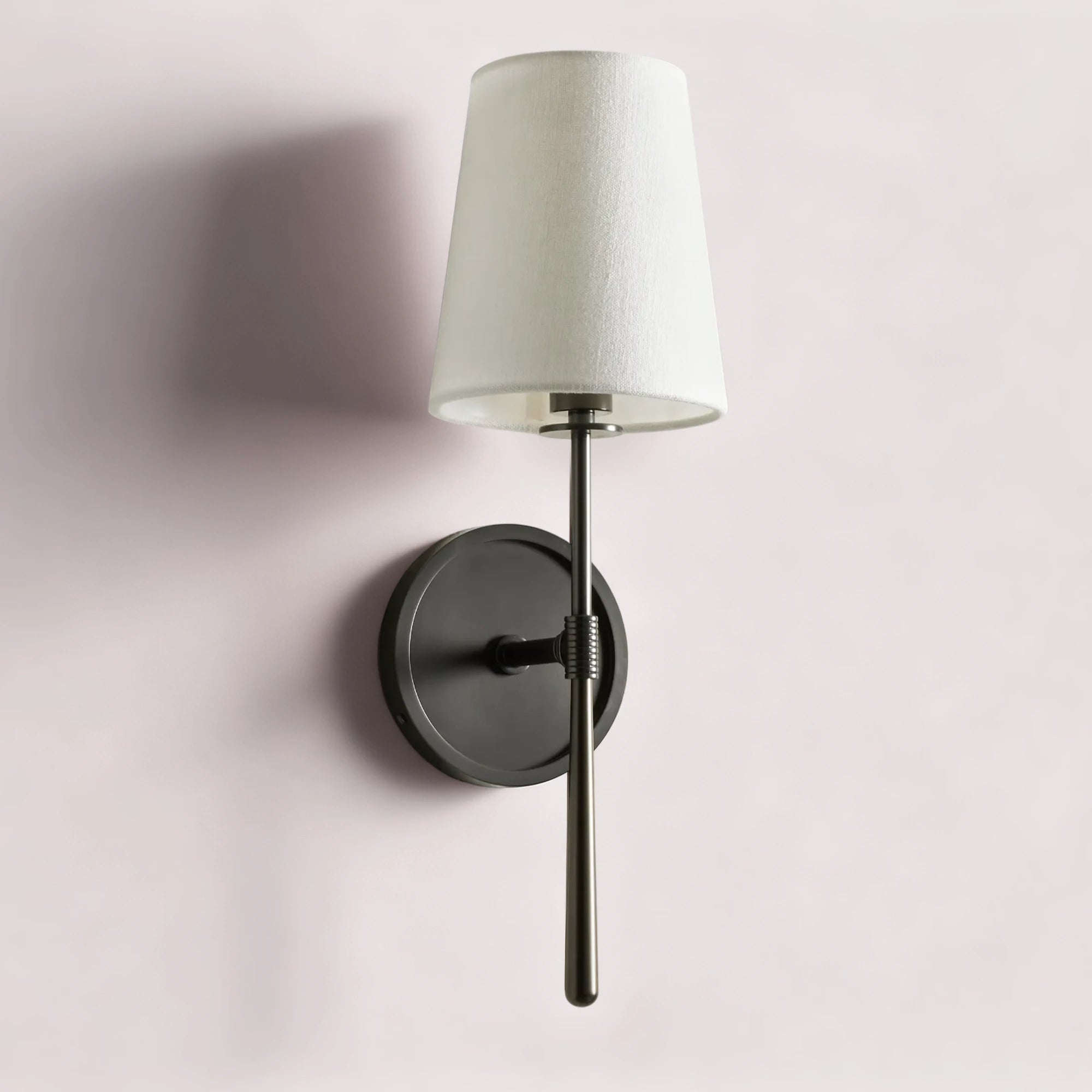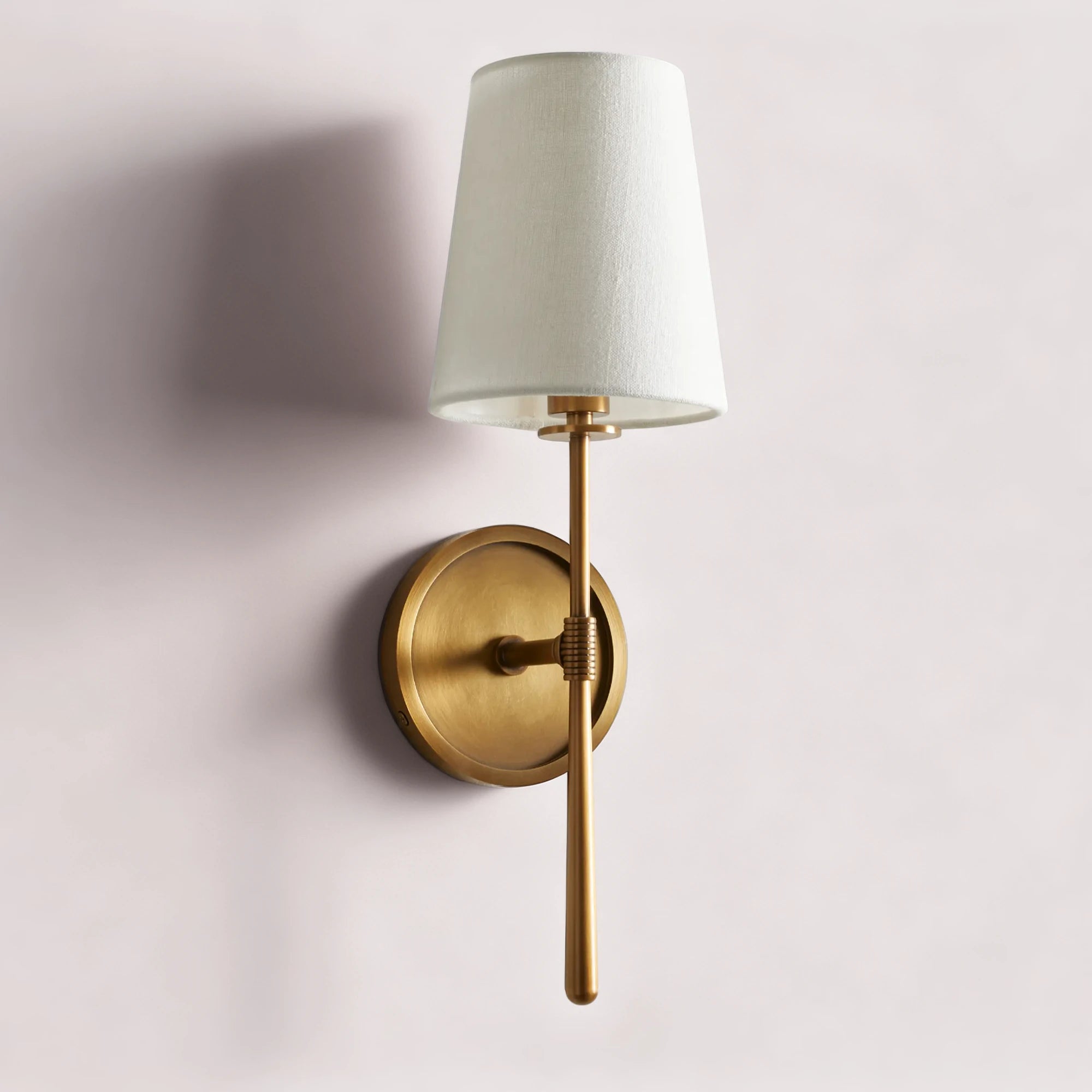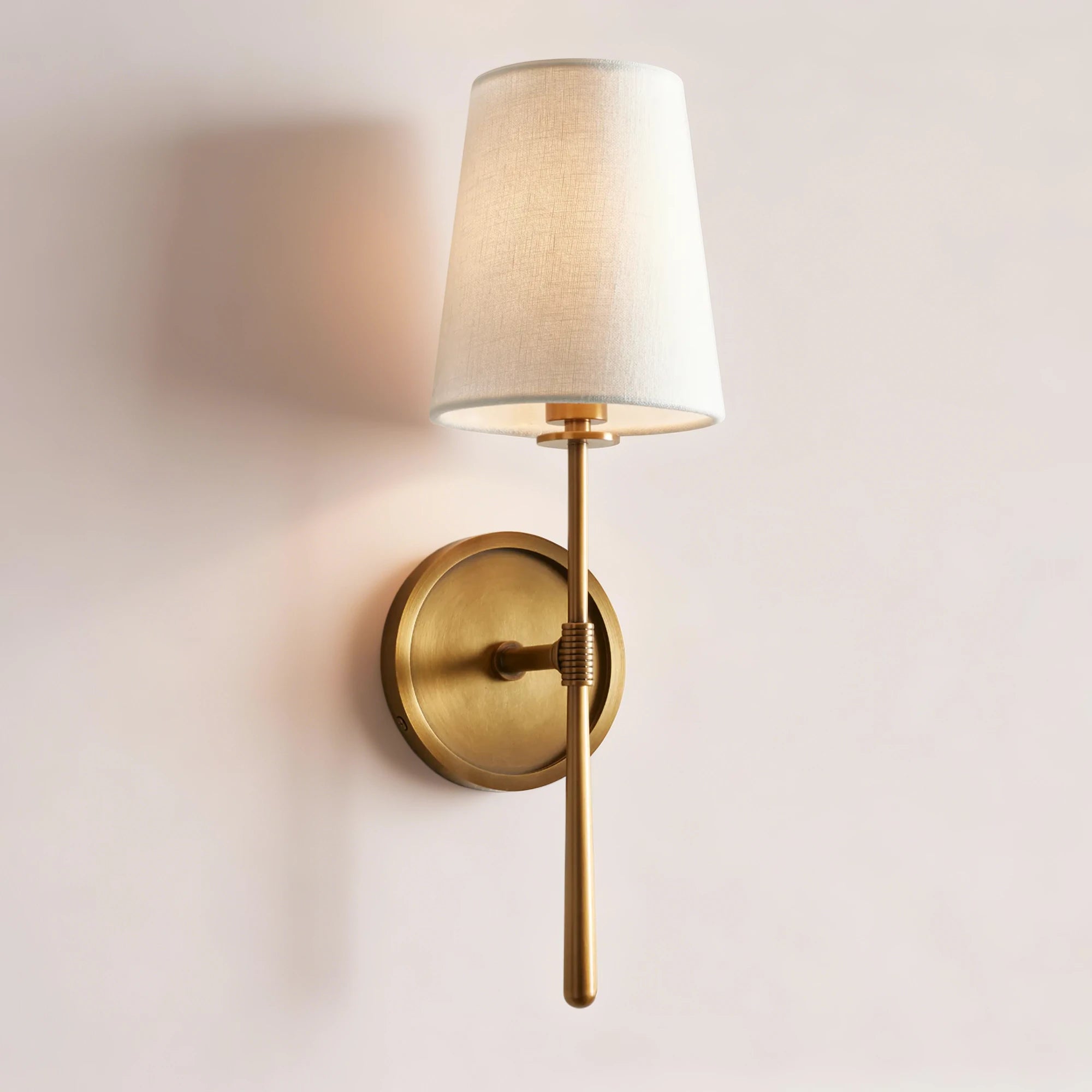 这款壁灯的设计灵感源自20世纪中期,其精致的火炬状轮廓搭配质感柔和的亚麻灯罩。点亮后,灯罩柔和地散发光线,在墙面上营造出温暖宜人的光晕。